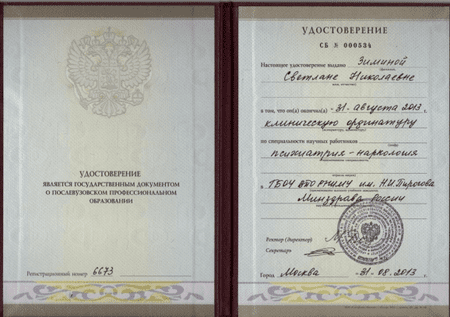 - Ординатура: ФГАОУ ВО РНИМУ им. Н.И. Пирогова. Специальность: психиатрия-наркология 2011-2013г.